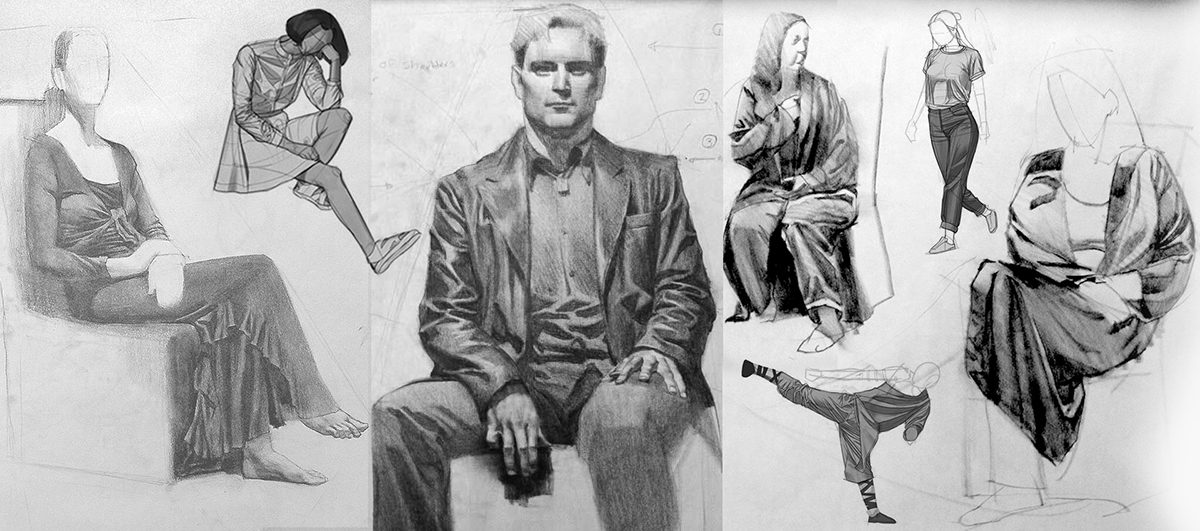 We will work with the armature from the analytical figure drawing class and work on draw through as learned in dynamic sketching class, organizing the clothing into simple easy to use forms using the draw through approach.